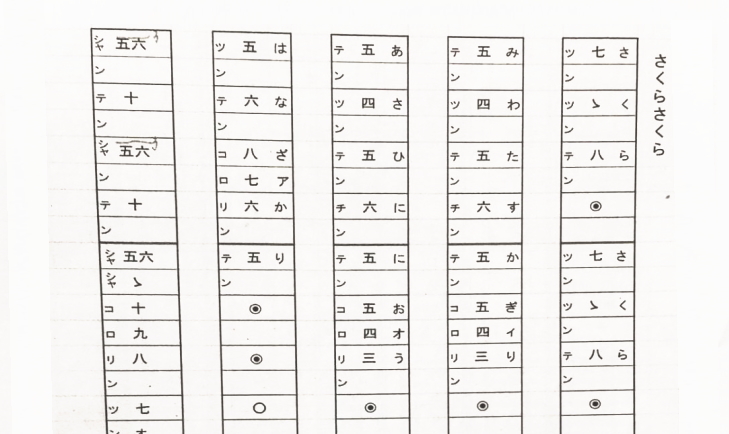 調弦は先生があっという間に済ませてくださっていました。爪を付けていよいよ実践です。譜面は以下の通り弾く弦を示す漢数字。縦書きです。何もかもが新鮮。