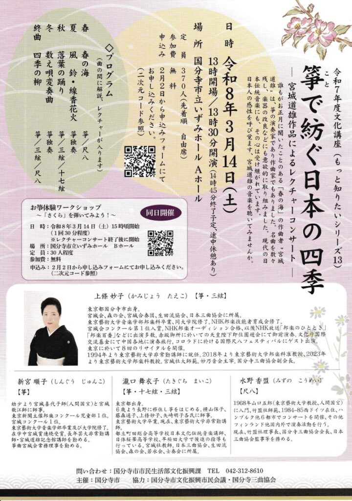 そして明治時代。宮城道雄によって西洋音楽の手法も取り入れられ、筝曲の世界も大きく広がったそうです。(この宮城道雄さんの曲がレクチャーコンサートにつながっていきます。)